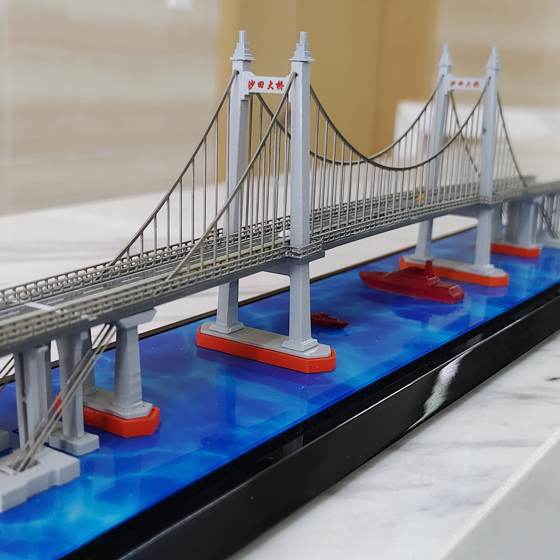 橋梁仿真模型是以實際橋梁為原型,電腦制作三維模型模擬橋的特性,激光或雕刻機加工制作,零部件采用焊接鉚接等拼接,精細打磨后再分色烤漆處理,真實原比例縮小。